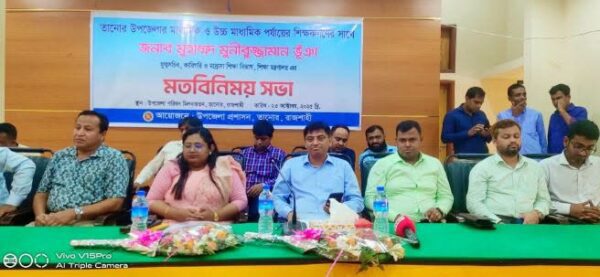 রাজশাহীর তানোর উপজেলার মাধ্যমিক ও উচ্চ মাধ্যমিক পর্যায়ের শিক্ষকগনের সাথে কারিগরি ও মাদ্রাসা শিক্ষা মন্ত্রানালয়ে যুগ্ন সচিবের মতবিনিময় সভা অনুষ্ঠিত হয়েছে। বৃহস্প্রতিবার( ২৩ শে অক্টেম্বর) দুপুর ২টার দিকে তানোর উপজেলা অডিটোরিয়ামে উপজেলা নির্বাহী অফিসার নাঈমা খানের সভাপতিত্বে মতবিনিময় সভায প্রধান অতিথি হিসেবে উপস্থিত ছিলেন কারিগরি ও মাদ্রাসা শিক্ষা মন্ত্রানালয়ের যুগ্ন সচিব জনাব মুহাম্মদ মুনীরুজ্জামান ভূঁঞা।
