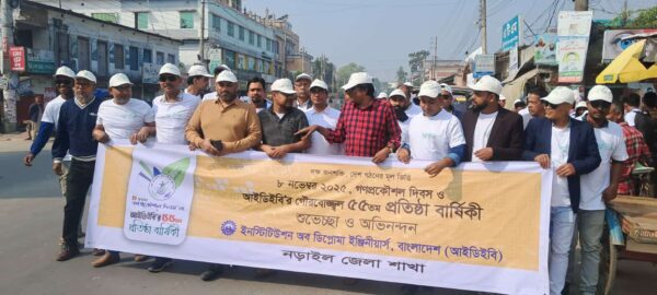 ৮ই নভেম্বর গণপ্রকৌশল দিবস ২০২৫ ও ইনস্টিটিউশন অব ডিপ্লোমা ইঞ্জিনিয়ার্স, বাংলাদেশ (আইডিইবি)-এর ৫৫তম প্রতিষ্ঠাবার্ষিকী উপলক্ষে নড়াইলে কেক কাটা ও বর্ণাঢ্য শোভাযাত্রা অনুষ্ঠিত হয়েছে।