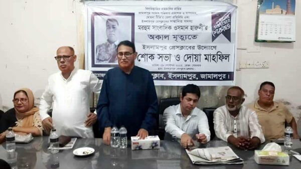 ইসলামপুর ( জামালপুর) প্রতিনিধি: জামালপুর সংবাদ পত্রিকার প্রকাশক- সম্পাদক, মোহনা টিভি জেলা প্রতিনিধি ও ইসলামপুর প্রেসক্লাবের সদস্য মরহুম সাংবাদিক ওসমান হারুনীর অকাল মৃত্যুতে ইসলামপুর প্রেসক্লাবের উদ্যোগে শোক সভা